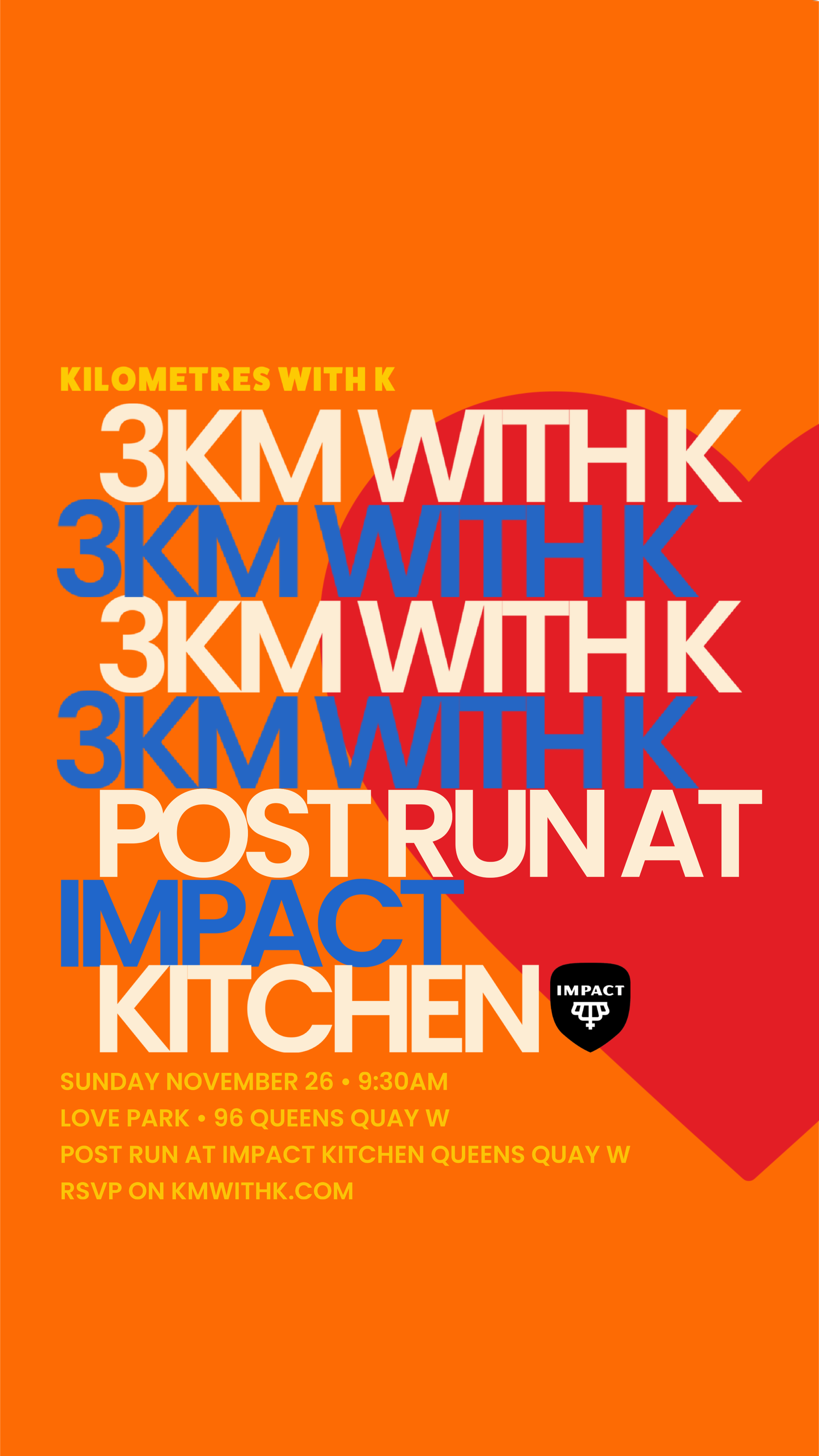 We’re still moving and groovin! Join us this upcoming Sunday at Love Park for a 3KM with K. Post run vibes will take place at Impact Kitchen (Queens Quay). As always, the crew receives 20% off the entire Impact menu when ordering on the Impact App. Download here!